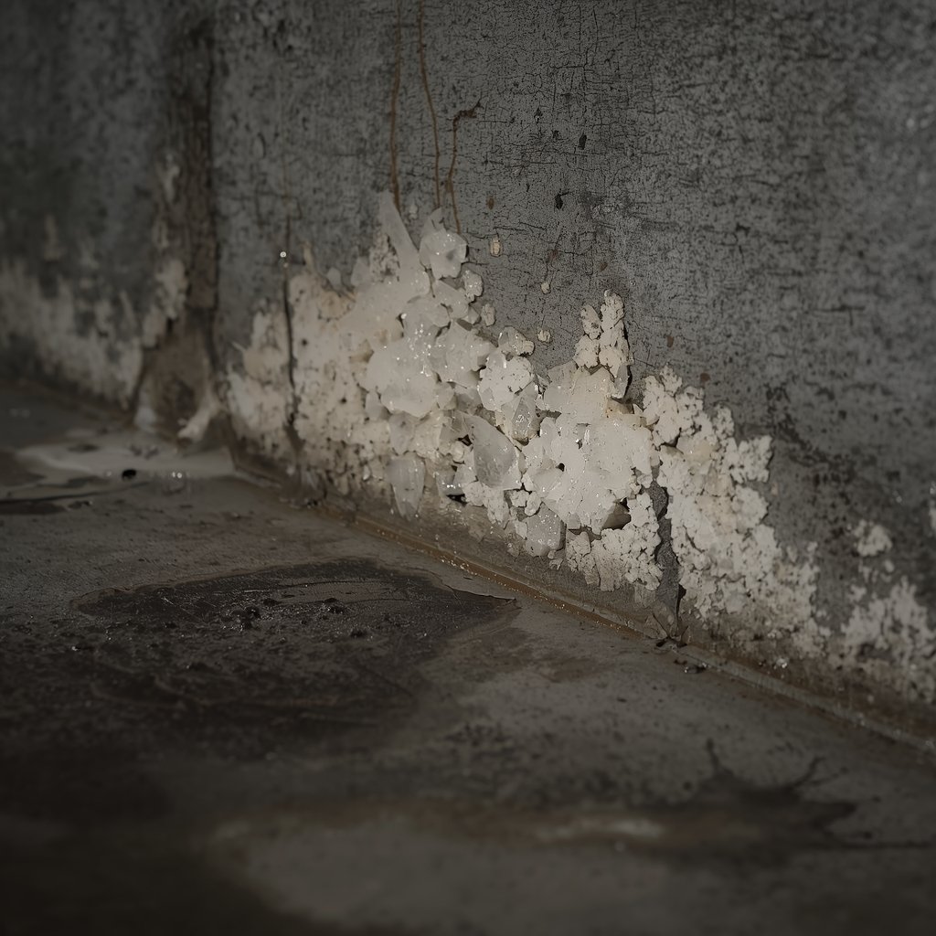 That white powdery residue on your basement walls is efflorescence — a mineral deposit left behind as water moves through concrete, confirming that moisture is actively infiltrating your foundation.